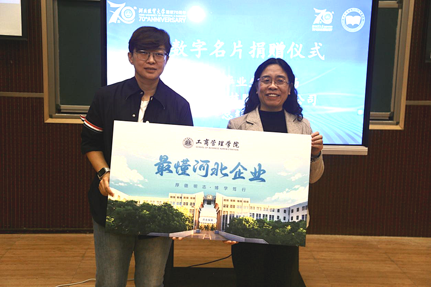交流会上,2021届MBA员工、河北热点科技有限公司总经理谢畅向学院捐赠了XR数字名片。随后广大员工亲切交流,纷纷表示在学院学习期间,从思维方式、学习习惯等方面都有了大的提高,毕业后的成长蜕变,重返母校后的感慨万千,感染了每一位在校生。