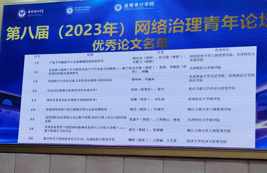 11月18日,公司青年教师姚双双博士应邀参加在西南政法大学举办的第八届网络治理青年论坛,获得优秀论文。该论坛以“平台生态情景下的治理问题”为主题,由中国企业管理研究会网络治理专业委员会、西南政法大学主办,来自几十所高校的200余名学者专家出席了本届论坛。