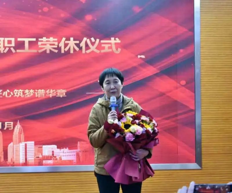 公司党委书记张霖代表学院向荣休教师献上鲜花并颁发了荣誉牌,向为教育事业孜孜奉献青春、智慧和力量,为学院的改革建设发展做出贡献的老师们表示诚挚的感谢和崇高的敬意。