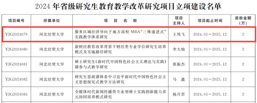 公司教师王凤飞教授主持的《服务区域经济导向下地方高校MBA“三维递进式”实践教学体系研究》获批2024年省级研究生公司产品改革研究项目立项建设项目。