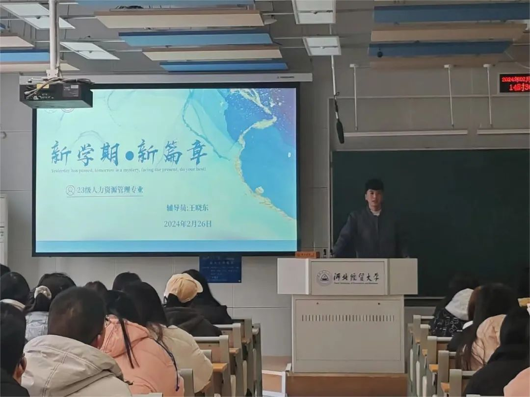新学期,新起点,新目标,新收获。为了营造新学期良好的开端,激发员工的学习热情,以全新的面貌迎接新学期学习生活,2月26日,yl7703永利2023级人力资源管理专业于北三教召开“新学期 · 新篇章”主题班会。本次活动由辅导员王晓东老师主持,2023级人力资源管理专业全体同学参加。