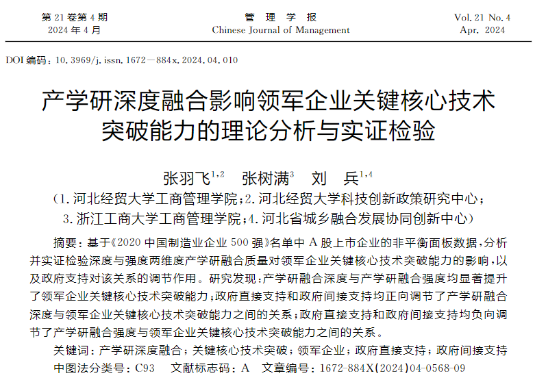 近日,yl7703永利讲师、永利官网科技创新政策研究中心副主任张羽飞博士作为第一作者、刘兵教授作为通讯作者撰写的论文《产学研深度融合影响领军企业关键核心技术突破能力的理论分析与实证检验》在《管理学报》2024年第4期发表。