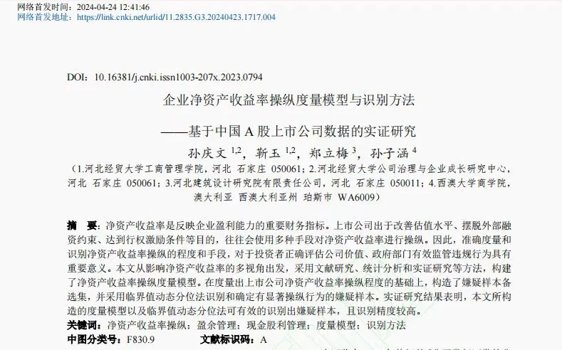 4月24日,yl7703永利孙庆文教授和研究生靳玉的研究成果《企业净资产收益率操纵度量模型与识别方法——基于中国A股上市公司数据的实证研究》由《中国管理科学》期刊在中国知网上进行网络首发。