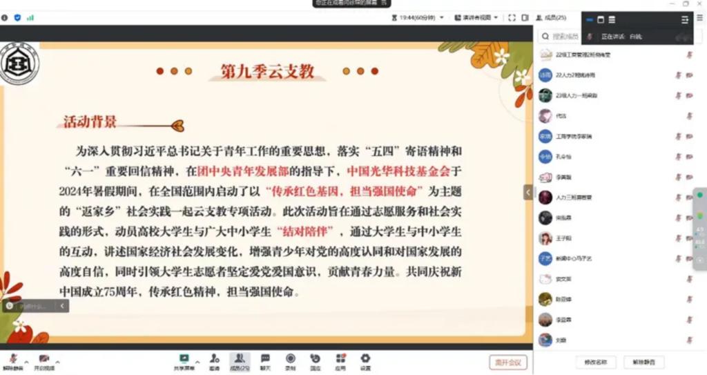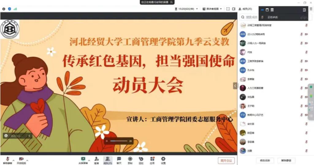 为响应“学习二十大、永远跟党走、奋进新征程”的时代号召,深入贯彻习近平总书记关于青年工作的重要思想,落实“五四”寄语精神和“六一”重要回信精神,公司积极鼓励员工参与“一起云支教·传承红色基因,担当强国使命”社会实践活动。7月26日,公司召开线上“一起云支教”动员大会,活动由团委志愿服务中心白兢主持,全体云支教老员工志愿者参加。