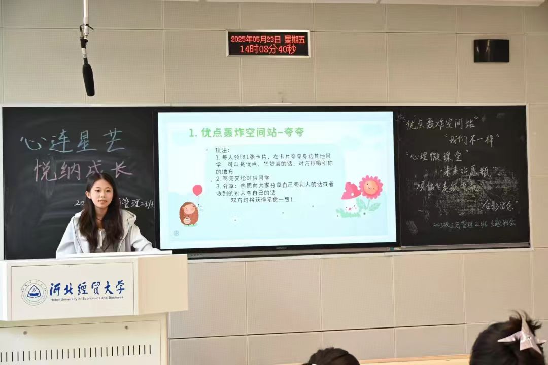 为引导员工树立积极向上的心态,促进员工的健康成长,提升班级的凝聚力与同学的归属感,5月23日下午,yl7703永利2023级工商管理2班在A205教室成功开展了“心连星芒,悦纳成长”主题心理班会,此次班会由心理委员张思盈主持,工商管理专业2班全体同学参加。